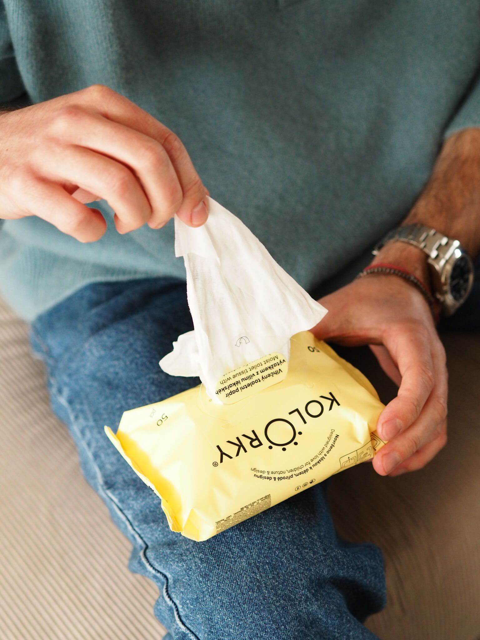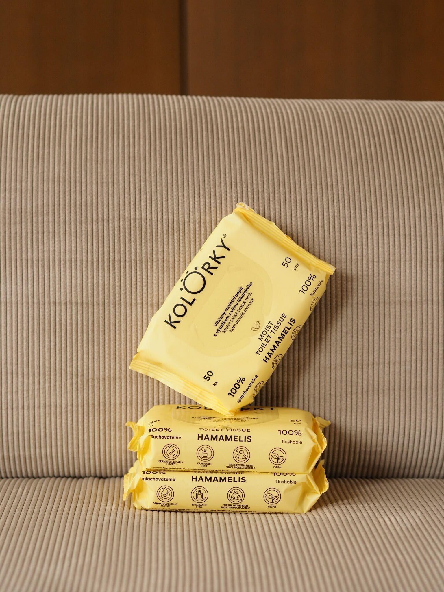 KOLORKY MOIST TOILET TISSUE Hamamelis jest wykonany z naturalnej włókniny, dzięki czemu ulega 100% biodegradacji. Ten nawilżany papier toaletowy zawiera ekstrakt z oczaru wirginijskiego, który łagodzi wrażliwą skórę, pomaga zapobiegać podrażnieniom oraz wspiera jej naturalną barierę ochronną. Papier toaletowy nie jest perfumowany. Opakowanie papieru toaletowego jest w 100% recyklingowalne, dzięki czemu można je wyrzucić do pojemnika na odpady segregowane w celu dalszego przetworzenia. Chusteczki są testowane dermatologicznie.